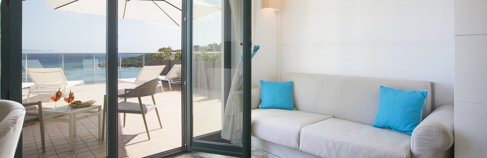 Nos chambres Suite exclusives sont spacieuses et accueillantes. Conçues dans des couleurs méditerranéennes, les suites disposent d'une grande terrasse panoramique d'où il est possible d'admirer la suggestive baie de Maladroxia.