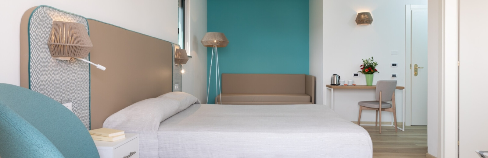 Le Junior Suite sono eleganti camere dotate di tutti i comfort ed accessori necessari per assicurarti una piacevole vacanza. Queste camere sono dotate di veranda o balcone con vista sulla baia di Maladroxia.